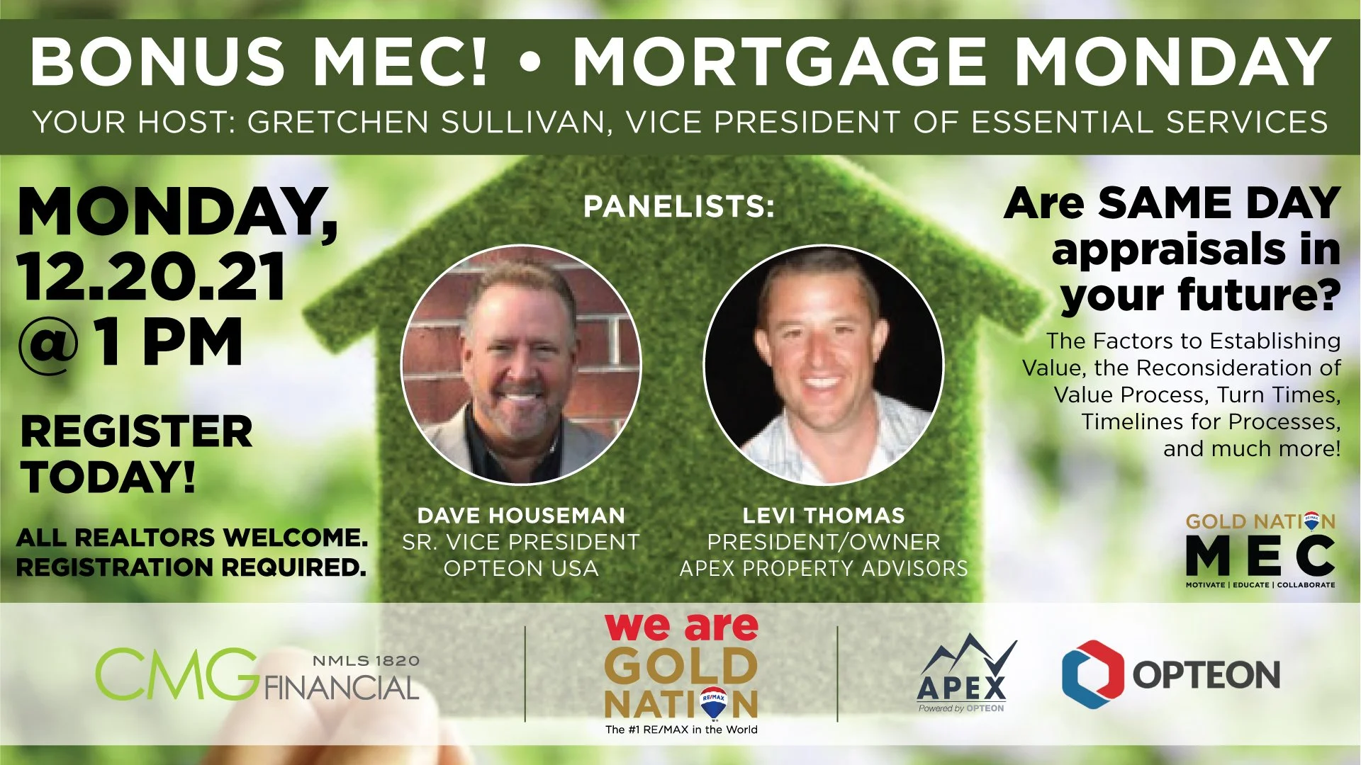 It is no secret that the appraisal process can be the make it or break it milestone in the real estate transaction. Join your MEC host Gretchen Sullivan, VP of Essential Services, with special guests Dave Houseman, SVP Opteon USA, and Levi Thomas, Owner / President Apex Property Advisors powered by Opteon, to find out more! See details below.