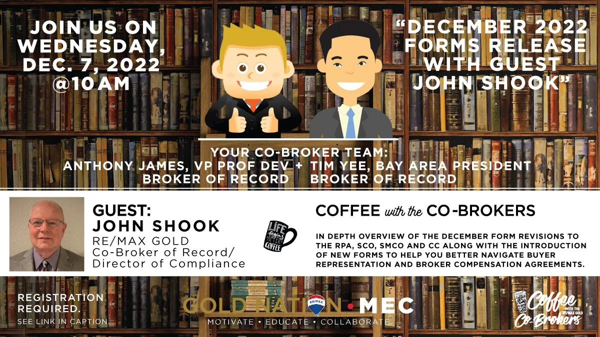 Tune in to the Season Finale of Coffee w/ The Co-Brokers for an in depth overview and discussion of the December 2022 Forms Release. Tune in to see form revisions to the RPA, SCO, SMCO and CC along with the introduction of new forms to help you better navigate buyer representation and broker compensation agreements.