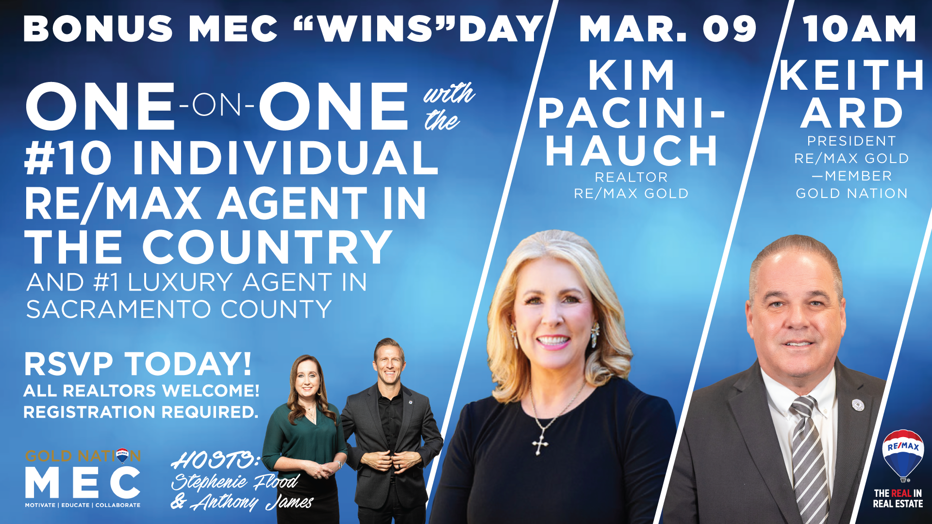 Join Keith Ard, President of RE/MAX Gold and your MEC “WINS”Day hosts, Stephenie Flood and Anthony James, for a One-on-One interview with Kim Pacini-Hauch, the #10 RE/MAX Agent in the country and the #1 Luxury Agent in Sacramento County (All Realtors. All Brokers). We will be talking with Kim about her journey to $100,000,000 in sales for 2021, and much more.