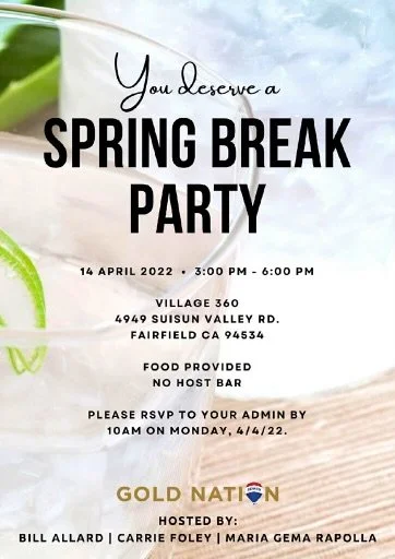 Spring Break Party Thursday, April 14, 2022 3:00 PM 6:00 PM 15:00 18:00 Gold Nation (map) Google Calendar ICS Spring Break Party!Please RSVP to your admin by 10AM Monday, 4/4/22