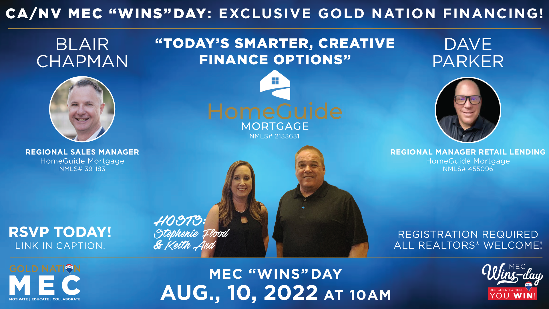 Join your MEC hosts, Stephenie Flood and Anthony James for a MEC “WINS” Day’s special CA/NV episode on 8/10 at 10 AM. We welcome guest presenters: Dave Parker and Blair Chapman from HomeGuide Mortgage who will be discussing today’s smarter and more creative financing options: