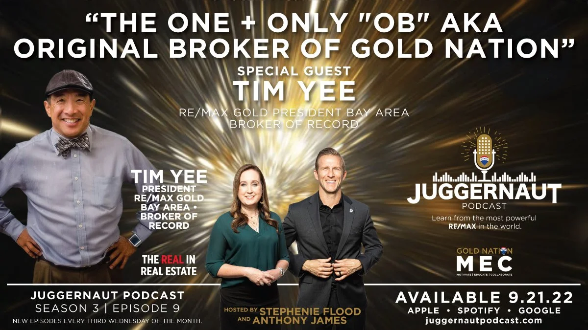 Join your Juggernaut podcast hosts Stephenie Flood and Anthony James, for an interview with the one-and-only "OB" aka Original Broker of Gold Nation! Tim Yee, President RE/MAX Gold Bay Area, Broker of Record will share his positive outlook on life, leadership, giving back, and how he has adapted in his 40 years in the real estate business.