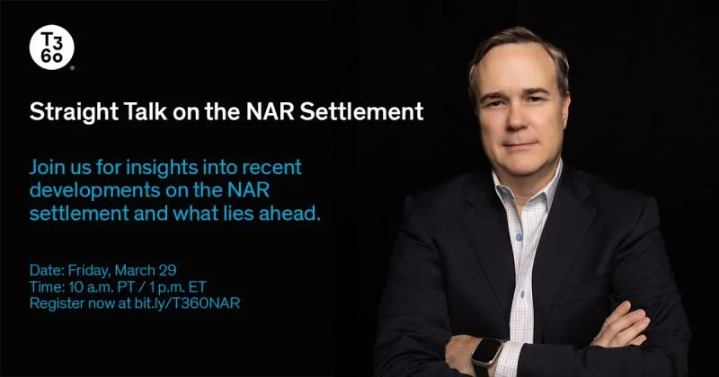 Straight Talk on the NAR Settlement (T3 Sixty) Friday, March 29, 2024 10:00 AM 11:00 AM 10:00 11:00 Gold Nation (map) Google Calendar ICS You Won’t Want To Miss ThisJoin T3 Sixty for insights into recent developments on the NAR settlement and what lies ahead. REGISTER